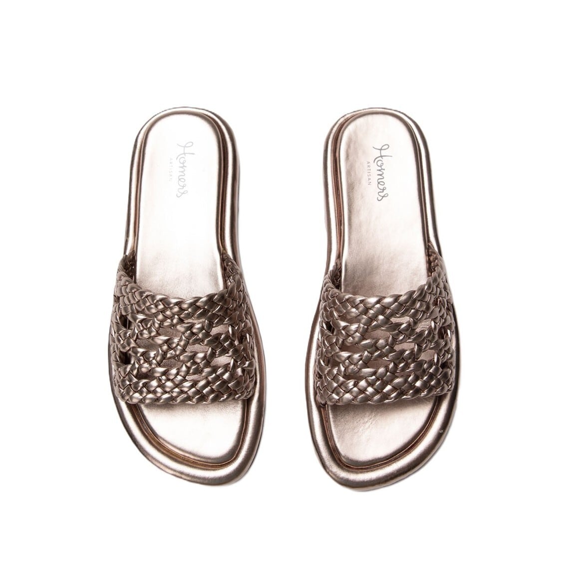 インソールに特殊なスポンジを入れヒールを付けた凝った作りのサンダル。アンダルシアの手編みメッシュの模様が涼しげ。